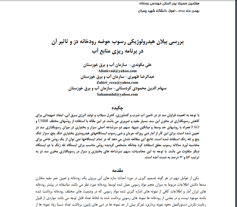 علی مکوندی بررسی بیلان هیدرولوژیکی رسوب حوضه رودخانه دز و تاثیر آن در برنامه ریزی منابع آب به همراه عبدالرضا ظهیری و سهام الدین محمودی کردستانی