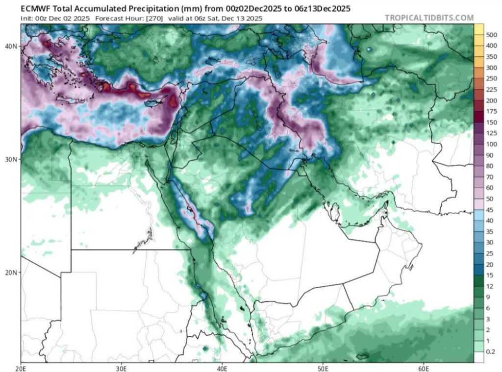 طبق خروجی مدل ECMWF، طی این ۱۰ روز بارشها گستره وسیعی را در بر میگیرند؛ از آذربایجان غربی و کردستان تا کرمانشاه، ایلام و غرب لرستان، الگوی بارشی پیوسته و ممتدی مشاهده میشود. شدت بارشها در برخی نقاط به حدی است که مجموع بارش تجمعی میتواند در نواحی مرتفع به سطح هشدار برسد. این مدل همچنین احتمال بارش برف قابلتوجه در گردنهها و مناطق کوهستانی زاگرس را تقویت میکند.
