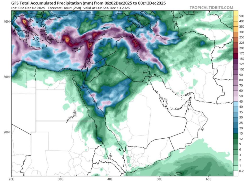 در مقابل، مدل GFS اگرچه محور بارش را مشابه ECMWF نشان میدهد، اما هستههای بارشی شدیدتری را برای شمالغرب و بخشهایی از زاگرس پیشبینی میکند. این مدل بارشها را متمرکزتر و نقطهمحورتر نمایش میدهد و در برخی نواحی، شدت بارش بهمراتب بالاتر از ECMWF است. این ویژگی میتواند به معنای خطر سیلابهای لحظهای و رواناب سریع در حوضههای کوچک، روستاهای دامنهای و مناطق شهری کمشیب باشد.