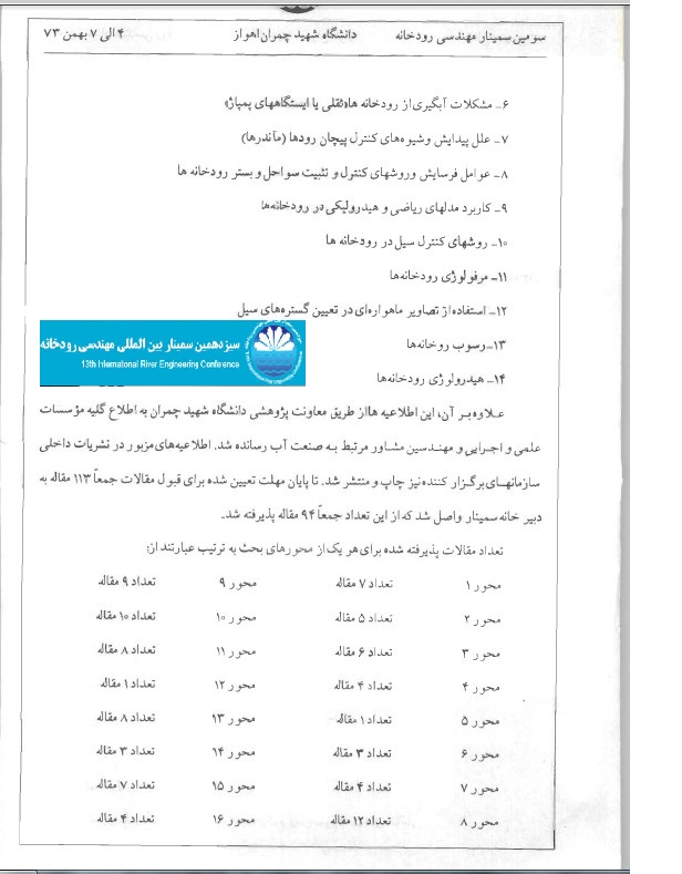 تلاش دبیرخانه سیزدهمین دوره سمینار بین المللی مهندسی رودخانه برای رسیدن به اسناد،مدارک و تصاویر این سمینار بی نتیجه بود. آرشیو دانشگاه که چیزی در کل برای ارائه نداشت و آرشیو سازمان آب وبرق خوزستان که تقریبا مدارک کاملی از دوره نخست داشت، در این دوره حرفی برای گفتن نداشت و آرشیو شرکت دزآب نیز از سال 1373 مجموعه اطلاعات را داشت .پس از این دوره می گذریم، گویی که دوره ای مربوط به قرنها پیش بوده است و پا به بهمن 1373 می گذاریم.