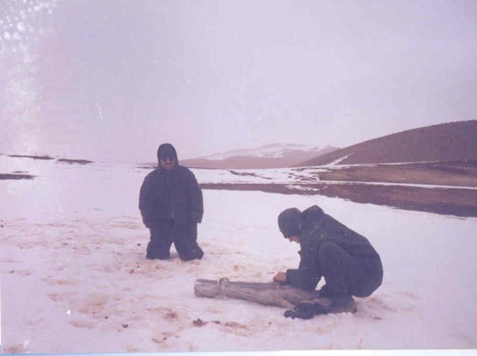 هوا چنان سرد شده بود که دستهای یخ زده ما توان فعالیت را به سختی مهیا می کرد در بالای کوهی که ما رسیدیم دریاچه ای قرار داشت که در زمستانها یخ می زد و ما باید در مناطقی اندازه گیری می کردیم که دریاچه قرار نداشت. مهندس داوطلب همکار ما از شرکت مدیریت منابع آب ایران منطقه را می شناخت او قبلا تابستان به مداب رفته بود. موقعی که نمونه پنجم را گرفتیم .ناگهان بوران و کولاک شروع شد . این اصلا خوب نبود ما اکنون در هنگام بوران در وسط شهر نبودیم بلکه بالای یک کوه پربرف دورافتاده بودیم و باید برمی گشتیم دو نمونه دیگر با زحمت اخذ شد اما دیگر نمی شد انجا بمانیم هوا خراب شده بود و اگر می ماندیم ممکن نبود نتوانیم برگردیم.