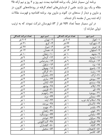علاوه بر ۷۵۹ نفر شرکت کننده رسمی تعداد قابل ملاحظه ای دانشجو از گروههای آموزشی ،آبیاری خاکشناسی عمران و زمین شناسی دانشگاه شهید چمران نیز بصورت غیر رسمی در سمینار شرکت نموده اند بطوریکه میتوان جمع افراد شرکت کننده را حدود ۱۰۰۰ نفر دانست.