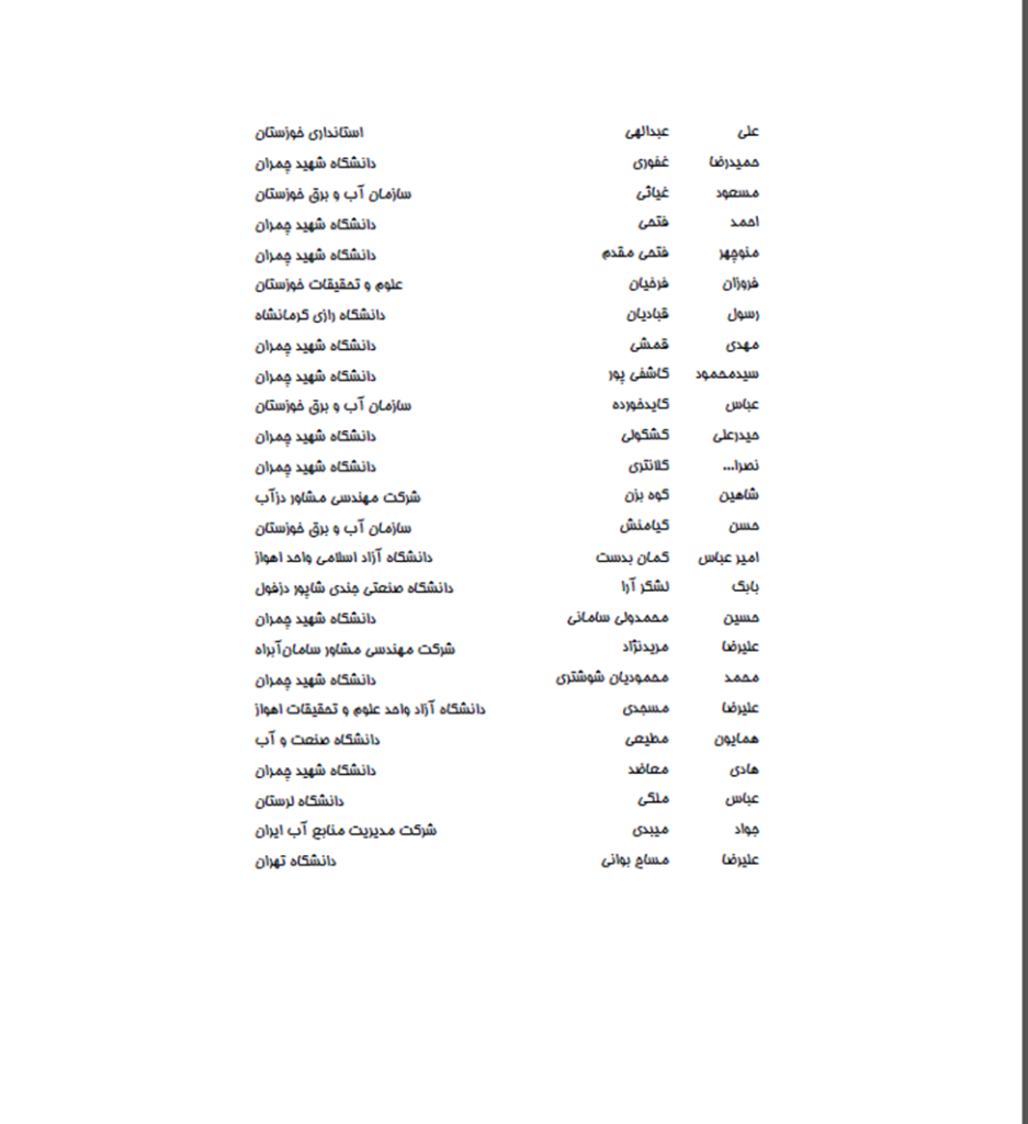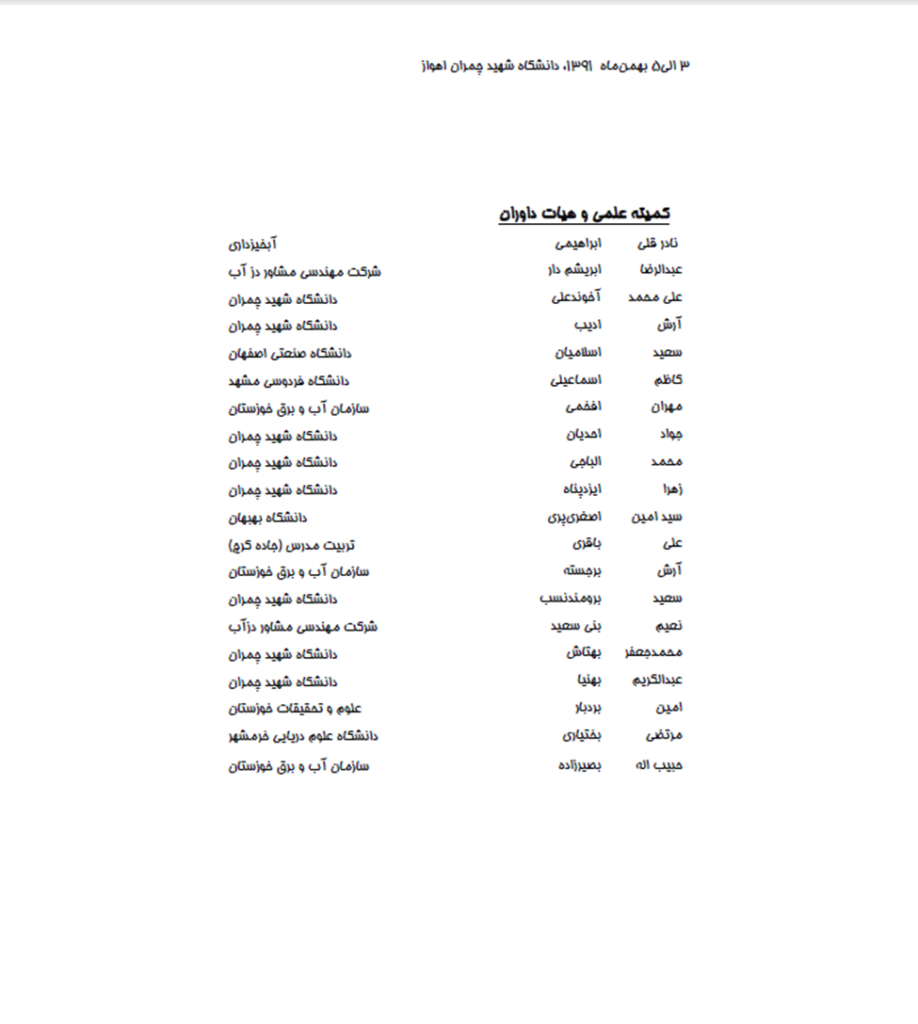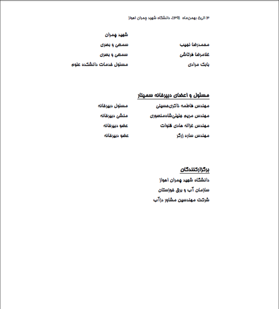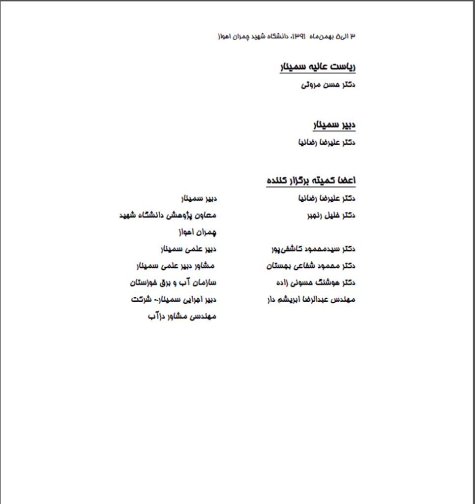 و دكتر هوشنگ حسوني زاده (نماينده سازمان آب و برق خوزستان) تشكر و قدرداني ويژه داشته باشم. همچنين از كليه مسئولين كميته و زيركميته هاي اجرايي كه تلاش شبانه روزي براي برگزاري باشكوه اين سمينار داشته اند بالاخص مهندس مسعود مشايخي تشكر و قدرداني مي نمايم.
