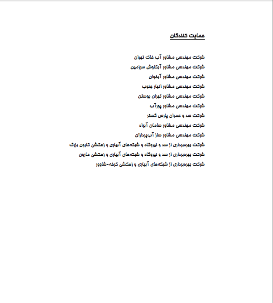 قطعاً بدون همكاري و همياري كليه دست اندركاران، برگزاري چنين سميناري با حدود 1200 نفر شركت كننده امكان پذير نمي باشد. اينجانب به عنوان نماينده برگزار كنندگان اين سمينار بين­المللي از كليه سازمان­ها و شركت­هاي مهندسي آب كه ما را دربرگزاري اين سمينار حمايت و ياري نموده اند تشكر و قدرداني مي نمايم.