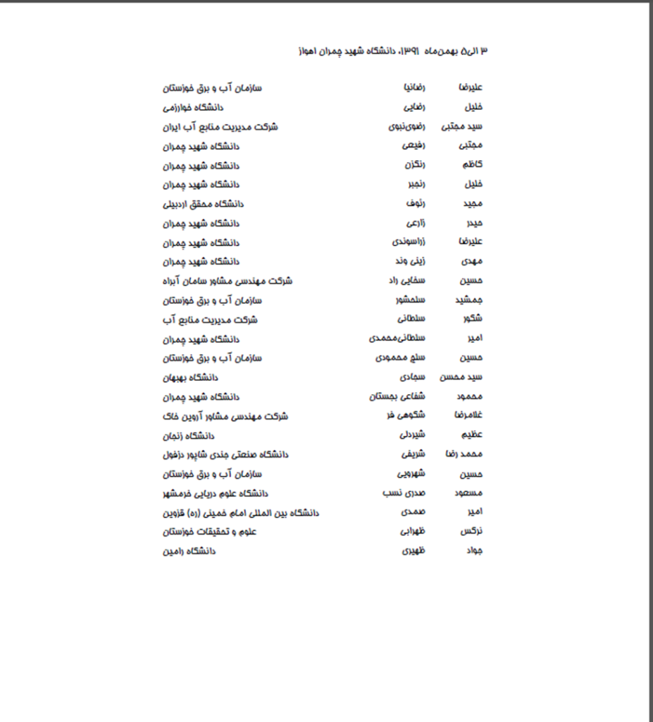 مي باشند. سمينار در طي3 روز برگزار گرديد كه تاريخ هاي 3 و 4 بهمن ماه براي ارائه مقالات به صورت شفاهي و پوستري و روز 5 بهمن ماه به بازديد از طرح هاي مهندسي رودخانه اختصاص يافت .